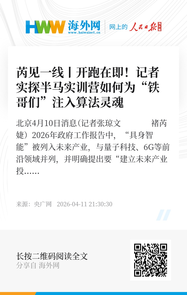 央广网北京4月10日消息(记者张琼文 褚芮婕)2026年政府工作报告中,“具身智能”被列入未来产业,与量子科技、6G等前沿领域并列,并明确提出要“建立未来产业投入增长和风险分担机制”。4月19日,2026北京亦庄半程马拉松暨人形机器人半程马拉松比赛将鸣枪开跑。届时,300余台人形机器人同场竞技,这是机器人耐力与性能的极限测试场。为此,央广网记者走进北京人形机器人创新中心的人形机器人半马实训营,实探“铁哥们”的备赛情况。