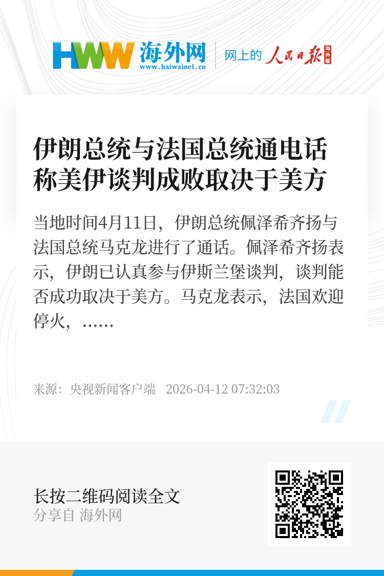 当地时间4月11日,伊朗总统佩泽希齐扬与法国总统马克龙进行了通话。佩泽希齐扬表示,伊朗已认真参与伊斯兰堡谈判,谈判能否成功取决于美方。
