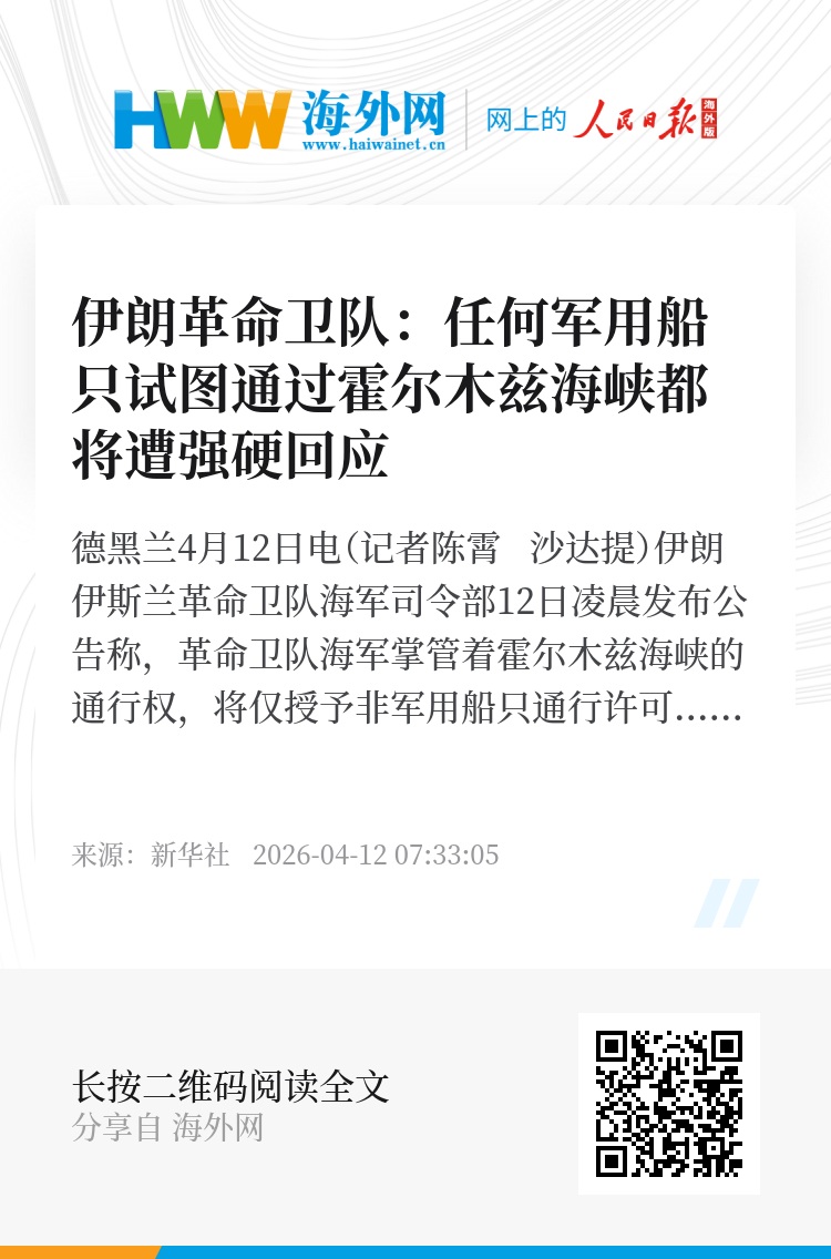 新华社德黑兰4月12日电(记者陈霄 沙达提)伊朗伊斯兰革命卫队海军司令部12日凌晨发布公告称,革命卫队海军掌管着霍尔木兹海峡的通行权,将仅授予非军用船只通行许可。