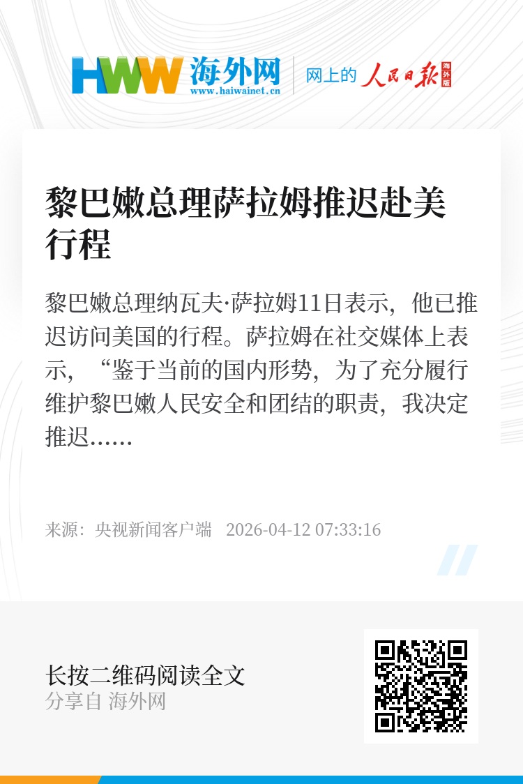 黎巴嫩总理纳瓦夫·萨拉姆11日表示,他已推迟访问美国的行程。