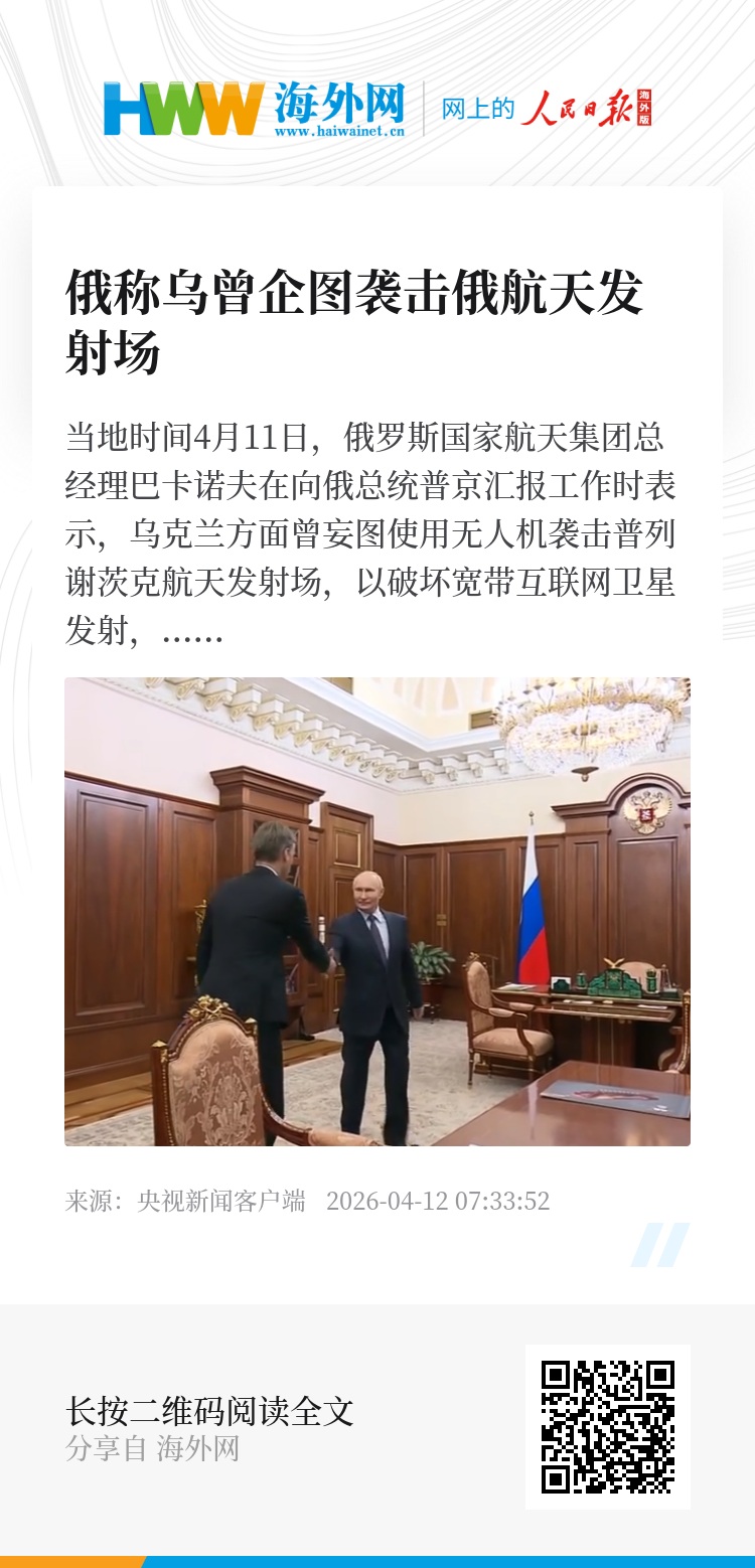 当地时间4月11日,俄罗斯国家航天集团总经理巴卡诺夫在向俄总统普京汇报工作时表示,乌克兰方面曾妄图使用无人机袭击普列谢茨克航天发射场,以破坏宽带互联网卫星发射,但图谋未能得逞。