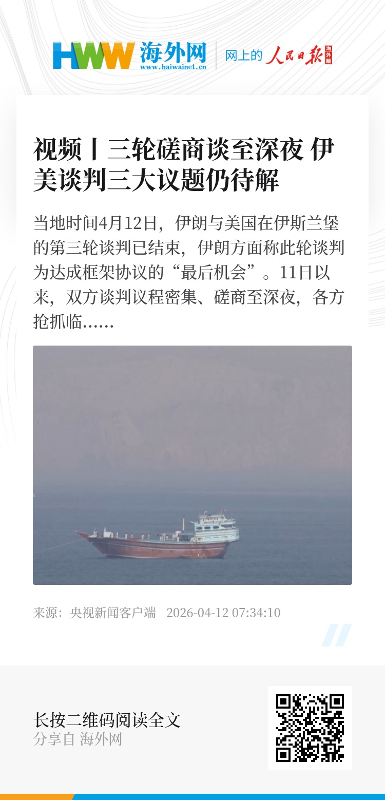 当地时间4月12日,伊朗与美国在伊斯兰堡的第三轮谈判已结束,伊朗方面称此轮谈判为达成框架协议的“最后机会”。11日以来,双方谈判议程密集、磋商至深夜,各方抢抓临时停火窗口期加紧博弈,但在霍尔木兹海峡管控、海外资产解冻、铀浓缩三大核心议题上分歧尖锐。谈判桌外,美军宣布在霍尔木兹海峡开展扫雷作业,以色列总理则声称将继续打击伊朗及其代理人。停火窗口期所剩无几,外交博弈与军事动作同步升温,中东局势正站在战争与和平的十字路口。