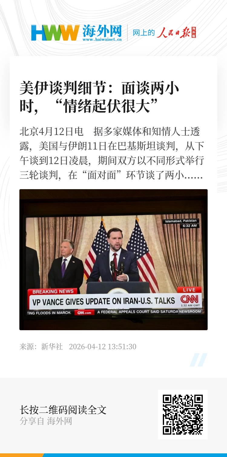 新华社北京4月12日电 据多家媒体和知情人士透露,美国与伊朗11日在巴基斯坦谈判,从下午谈到12日凌晨,期间双方以不同形式举行三轮谈判,在“面对面”环节谈了两小时,过程中双方“情绪起伏很大”。