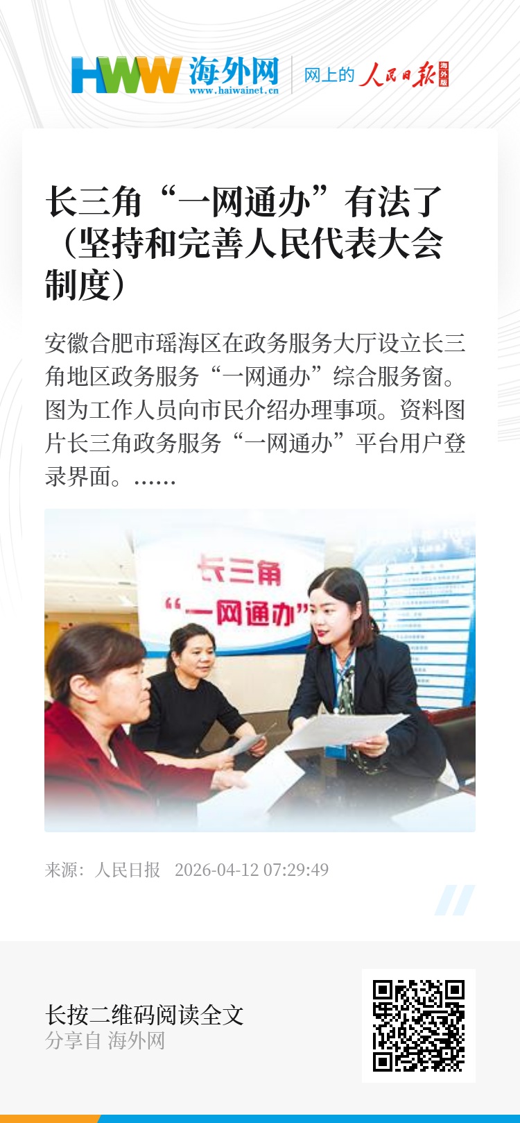 3月下旬,上海、江苏、浙江、安徽三省一市人大常委会相继表决通过《促进长三角政务服务“一网通办”规定》(以下简称《规定》),该《规定》将于今年5月1日起同步施行。