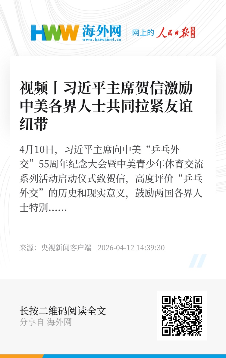 4月10日,习近平主席向中美“乒乓外交”55周年纪念大会暨中美青少年体育交流系列活动启动仪式致贺信,高度评价“乒乓外交”的历史和现实意义,鼓励两国各界人士特别是青年一代相知相亲、携手前行,为两国关系注入强大动力和温暖能量。习近平主席的贺信在中美各界人士中引发热烈反响。