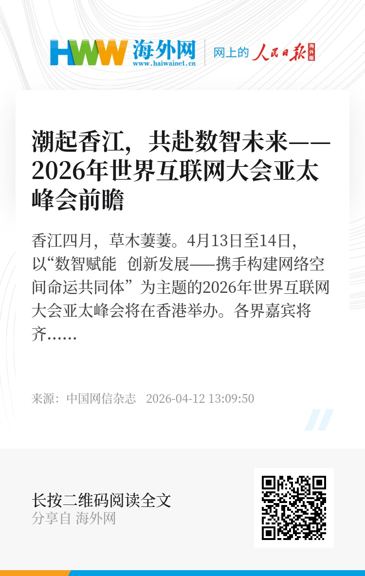 香江四月,草木萋萋。4月13日至14日,以“数智赋能 创新发展——携手构建网络空间命运共同体”为主题的2026年世界互联网大会亚太峰会将在香港举办。各界嘉宾将齐聚香江之畔,为推动数智技术向善普惠发展,携手构建网络空间命运共同体贡献智慧与力量。