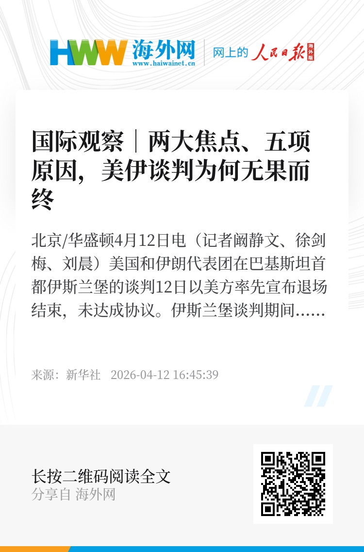 新华社北京/华盛顿4月12日电(记者阚静文、徐剑梅、刘晨)美国和伊朗代表团在巴基斯坦首都伊斯兰堡的谈判12日以美方率先宣布退场结束,未达成协议。