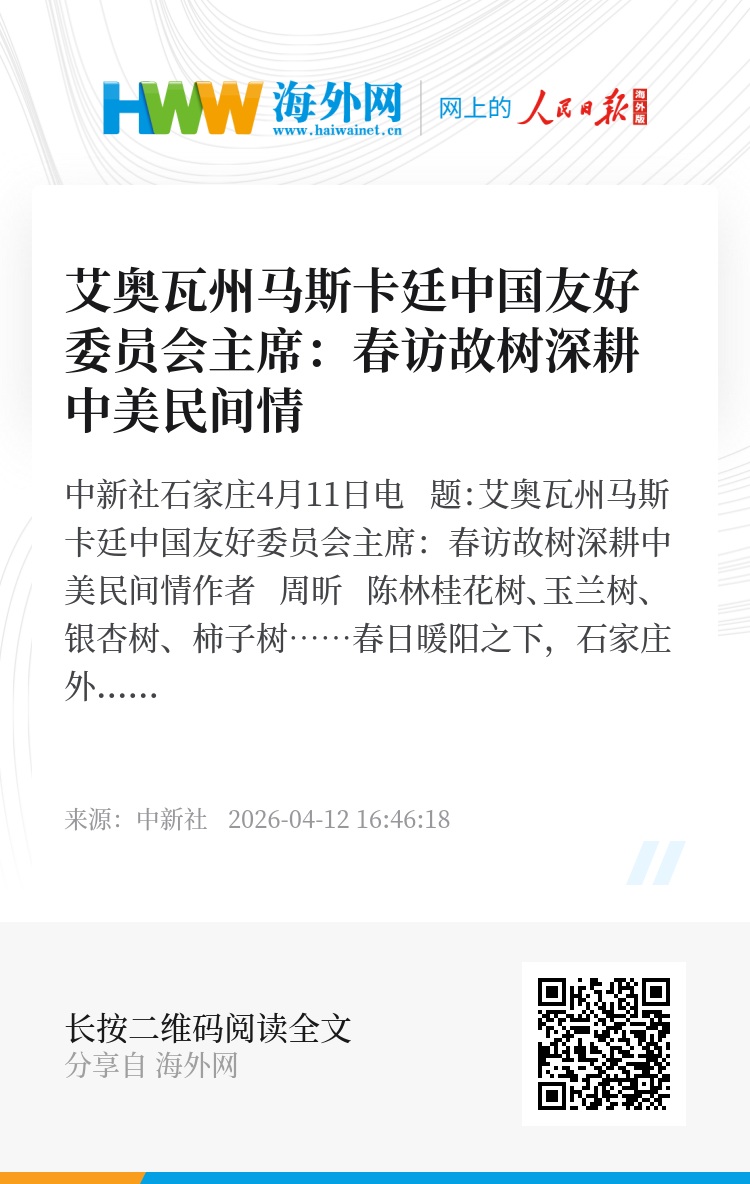 中新社石家庄4月11日电 题:艾奥瓦州马斯卡廷中国友好委员会主席:春访故树深耕中美民间情