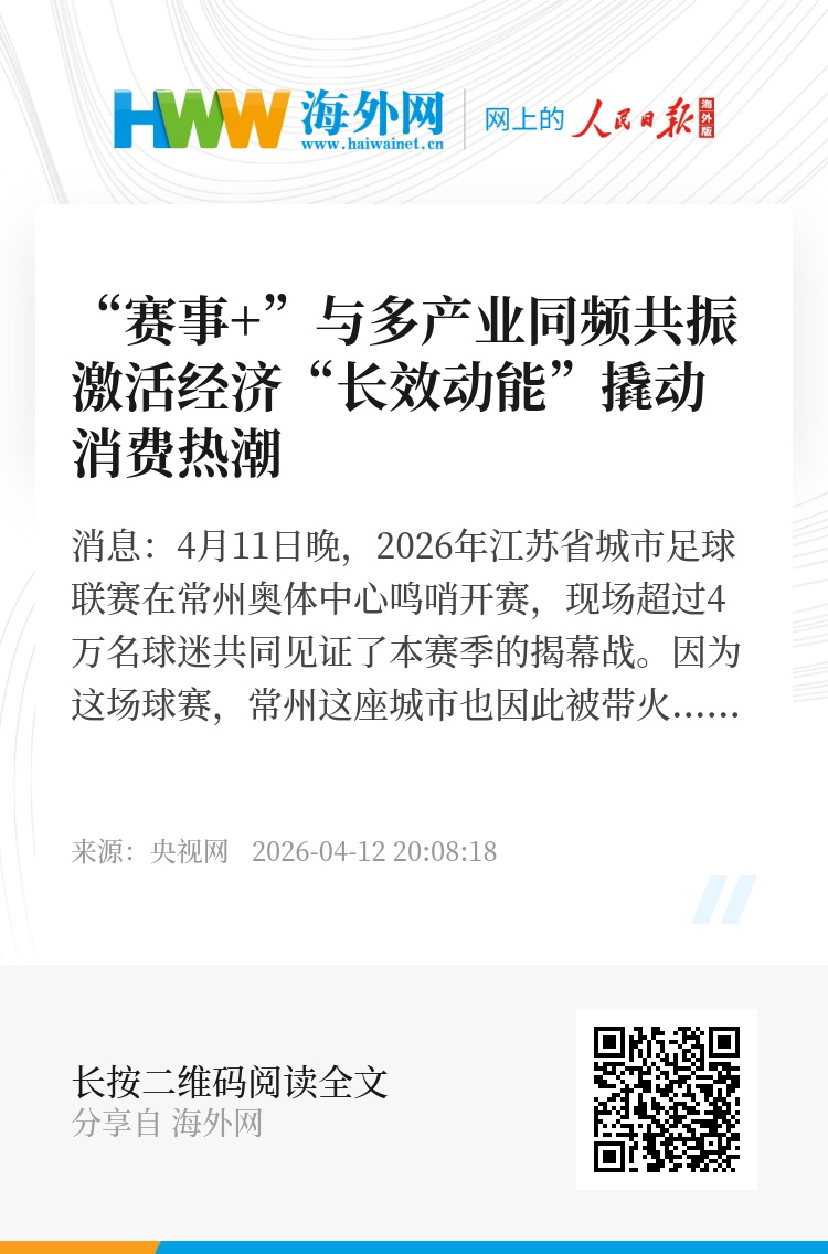 央视网消息:4月11日晚,2026年江苏省城市足球联赛在常州奥体中心鸣哨开赛,现场超过4万名球迷共同见证了本赛季的揭幕战。因为这场球赛,常州这座城市也因此被带火。