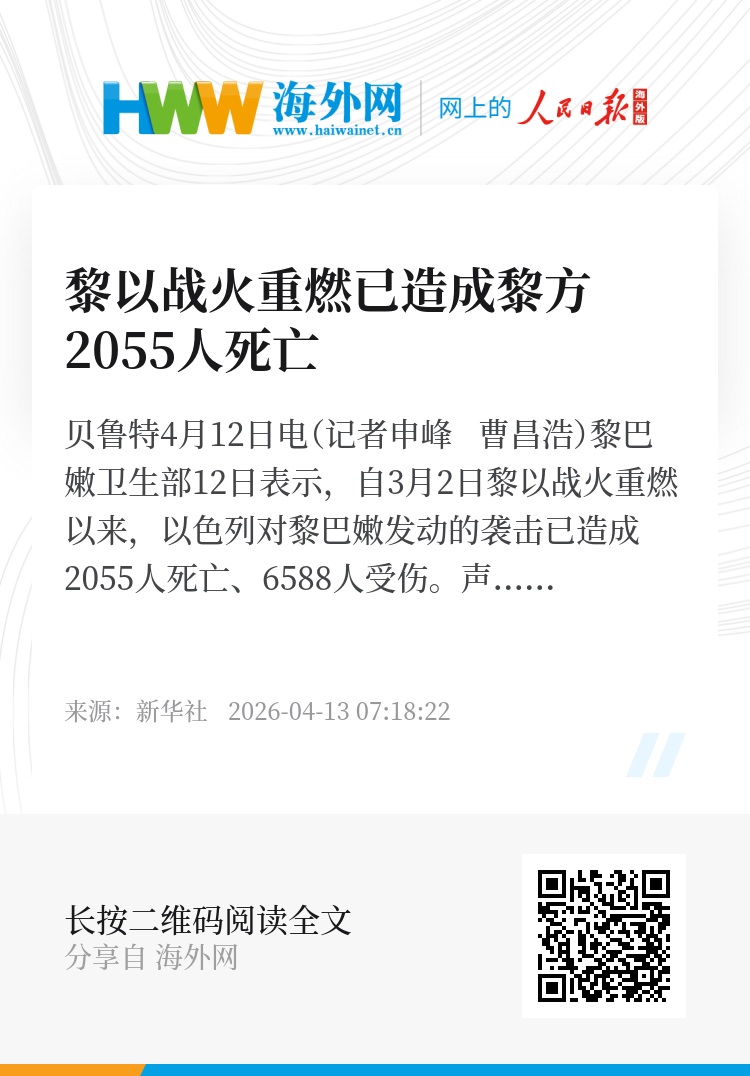 新华社贝鲁特4月12日电(记者申峰 曹昌浩)黎巴嫩卫生部12日表示,自3月2日黎以战火重燃以来,以色列对黎巴嫩发动的袭击已造成2055人死亡、6588人受伤。