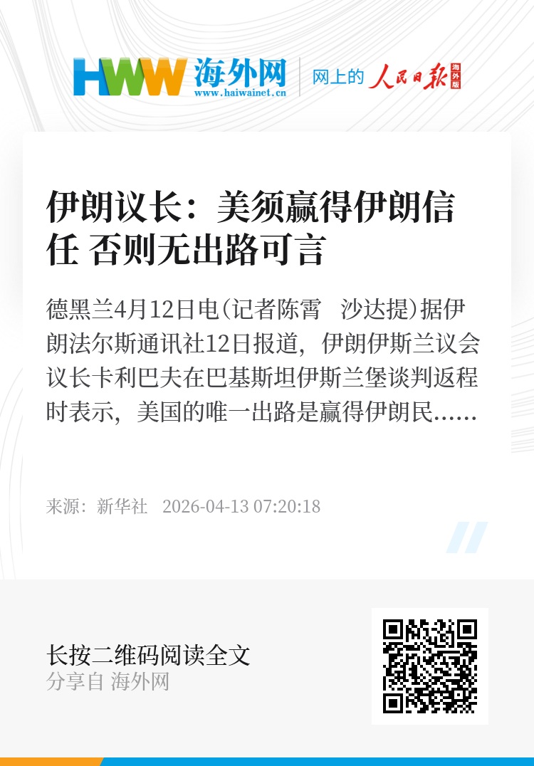 新华社德黑兰4月12日电(记者陈霄 沙达提)据伊朗法尔斯通讯社12日报道,伊朗伊斯兰议会议长卡利巴夫在巴基斯坦伊斯兰堡谈判返程时表示,美国的唯一出路是赢得伊朗民族的信任,如果再次考验伊朗的意志,伊朗将给美国“一个更大的教训”。