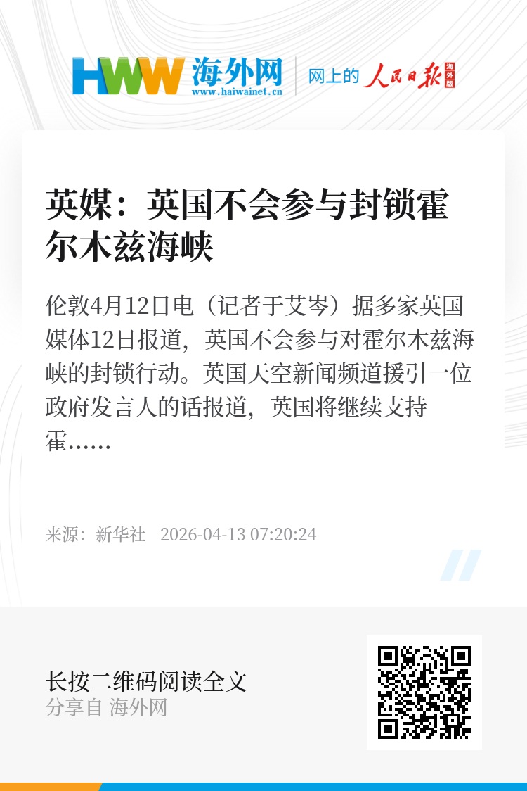 新华社伦敦4月12日电(记者于艾岑)据多家英国媒体12日报道,英国不会参与对霍尔木兹海峡的封锁行动。