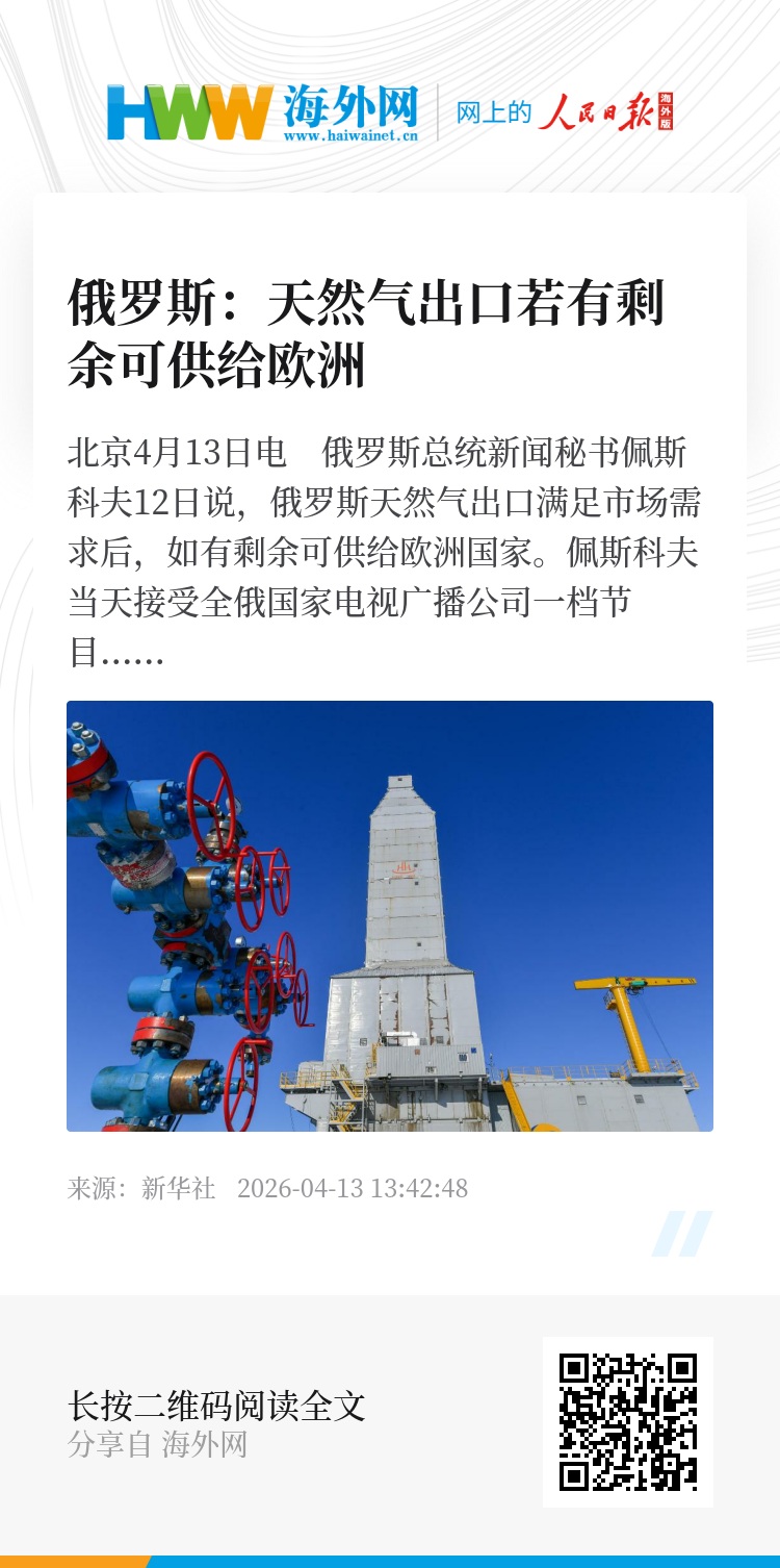 新华社北京4月13日电 俄罗斯总统新闻秘书佩斯科夫12日说,俄罗斯天然气出口满足市场需求后,如有剩余可供给欧洲国家。
