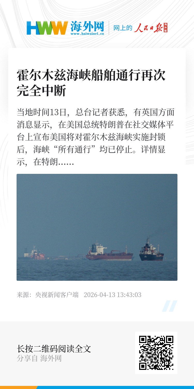 当地时间13日,总台记者获悉,有英国方面消息显示,在美国总统特朗普在社交媒体平台上宣布美国将对霍尔木兹海峡实施封锁后,海峡“所有通行”均已停止。