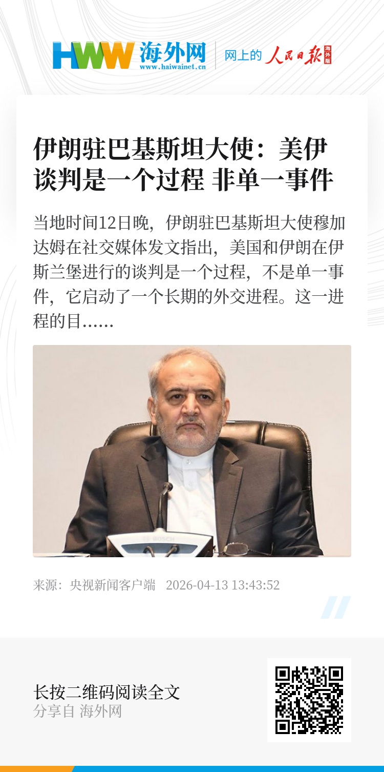 当地时间12日晚,伊朗驻巴基斯坦大使穆加达姆在社交媒体发文指出,美国和伊朗在伊斯兰堡进行的谈判是一个过程,不是单一事件,它启动了一个长期的外交进程。这一进程的目标仍然是保障伊朗人民的权利,在互信和决心的支持下,持续的接触可以带来持久的外交成果。