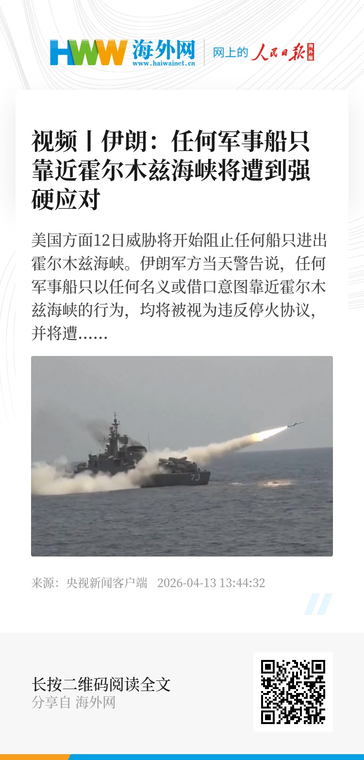 美国方面12日威胁将开始阻止任何船只进出霍尔木兹海峡。伊朗军方当天警告说,任何军事船只以任何名义或借口意图靠近霍尔木兹海峡的行为,均将被视为违反停火协议,并将遭到严厉的强硬应对。