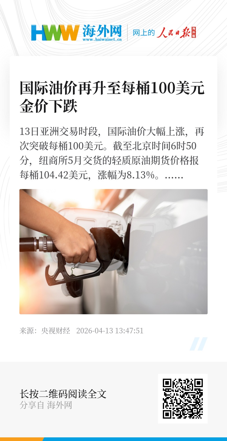13日亚洲交易时段,国际油价大幅上涨,再次突破每桶100美元。截至北京时间6时50分,纽商所5月交货的轻质原油期货价格报每桶104.42美元,涨幅为8.13%。6月交货的布伦特原油期货价格报每桶102.36美元,上涨7.52%。