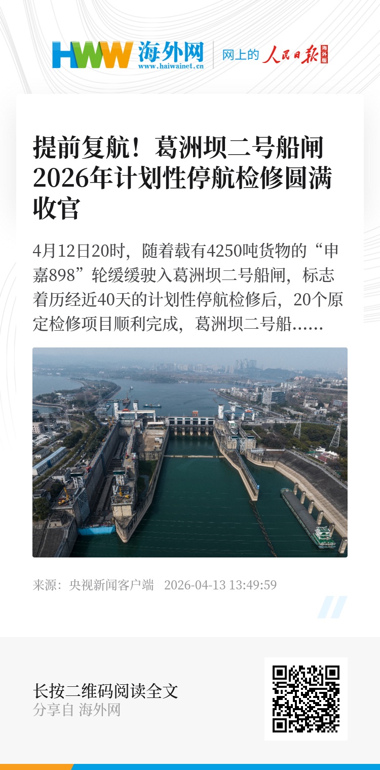 4月12日20时,随着载有4250吨货物的“申嘉898”轮缓缓驶入葛洲坝二号船闸,标志着历经近40天的计划性停航检修后,20个原定检修项目顺利完成,葛洲坝二号船闸正式恢复通航,较计划时间提前12小时。