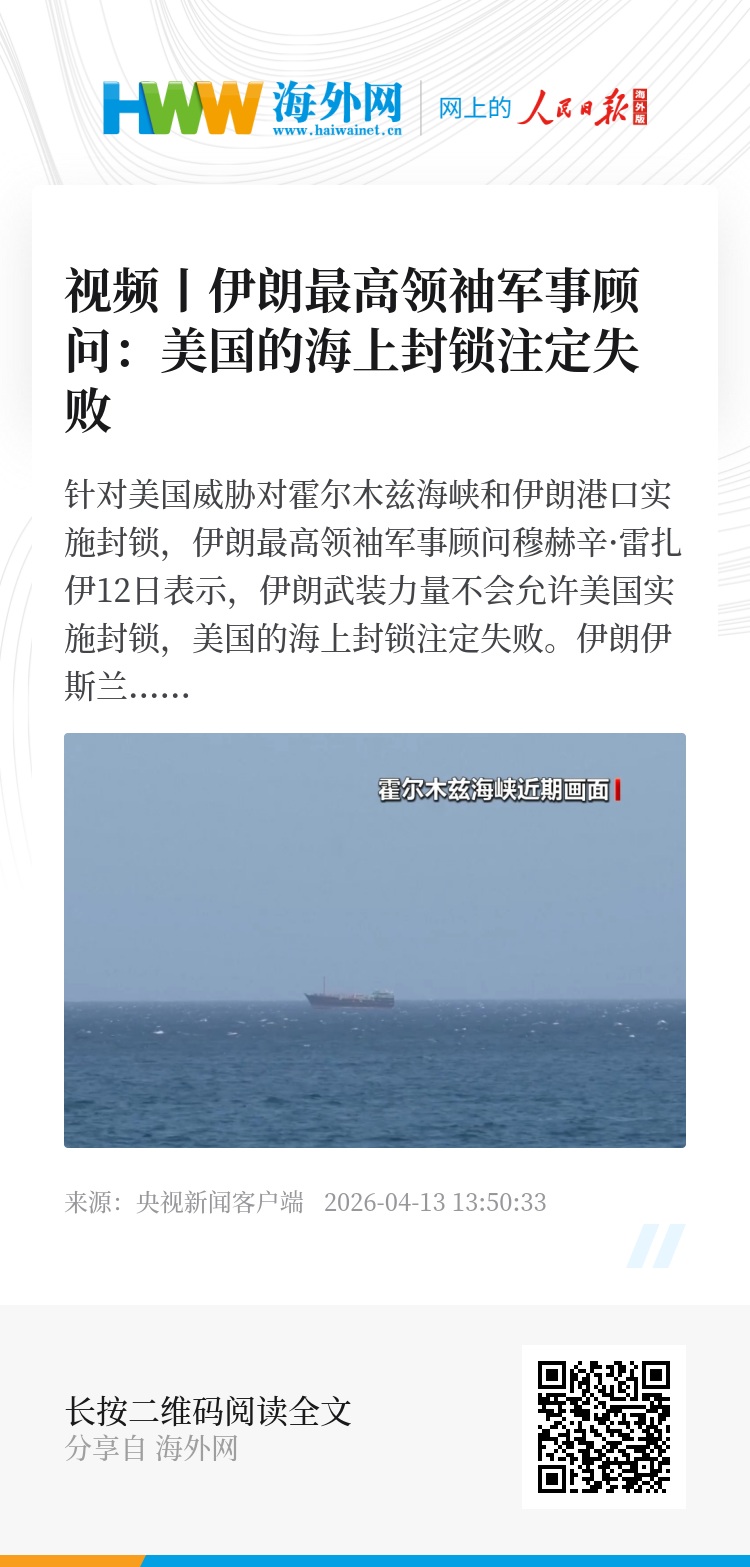 美国总统特朗普12日早些时候在社交媒体发文称,美国海军将开始阻止任何船只进出霍尔木兹海峡。美国中央司令部同日说,其部队将于美国东部时间13日10时、也就是北京时间13日22时,对所有进出伊朗港口的船只实施封锁。