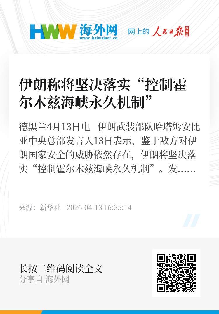 新华社德黑兰4月13日电 伊朗武装部队哈塔姆安比亚中央总部发言人13日表示,鉴于敌方对伊朗国家安全的威胁依然存在,伊朗将坚决落实“控制霍尔木兹海峡永久机制”。