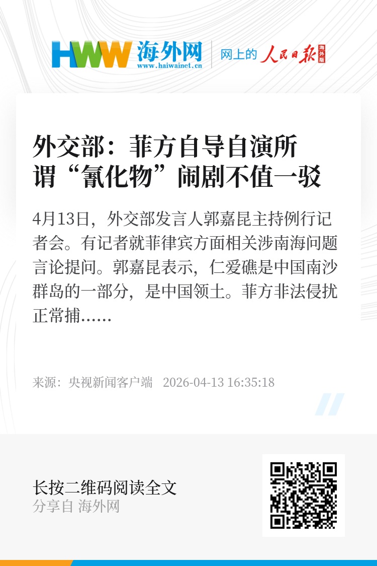 郭嘉昆表示,仁爱礁是中国南沙群岛的一部分,是中国领土。菲方非法侵扰正常捕鱼的中国渔船,抢夺渔民生活物资,还自导自演所谓“氰化物”闹剧,完全不具有可信度,不值一驳。(总台央视记者 黄惠馨)