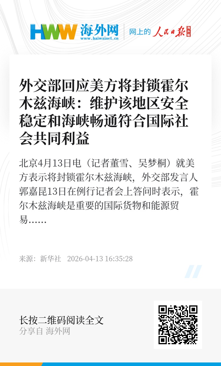 新华社北京4月13日电(记者董雪、吴梦桐)就美方表示将封锁霍尔木兹海峡,外交部发言人郭嘉昆13日在例行记者会上答问时表示,霍尔木兹海峡是重要的国际货物和能源贸易通道,维护该地区的安全稳定和畅通符合国际社会共同利益。海峡通航受阻的根源在于伊朗战事,解决这一问题的出路是尽快停火止战。各方应该保持冷静和克制。中方愿继续发挥积极建设性作用。