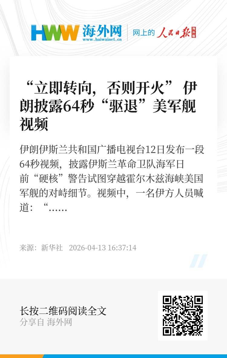 伊朗伊斯兰共和国广播电视台12日发布一段64秒视频,披露伊斯兰革命卫队海军日前“硬核”警告试图穿越霍尔木兹海峡美国军舰的对峙细节。