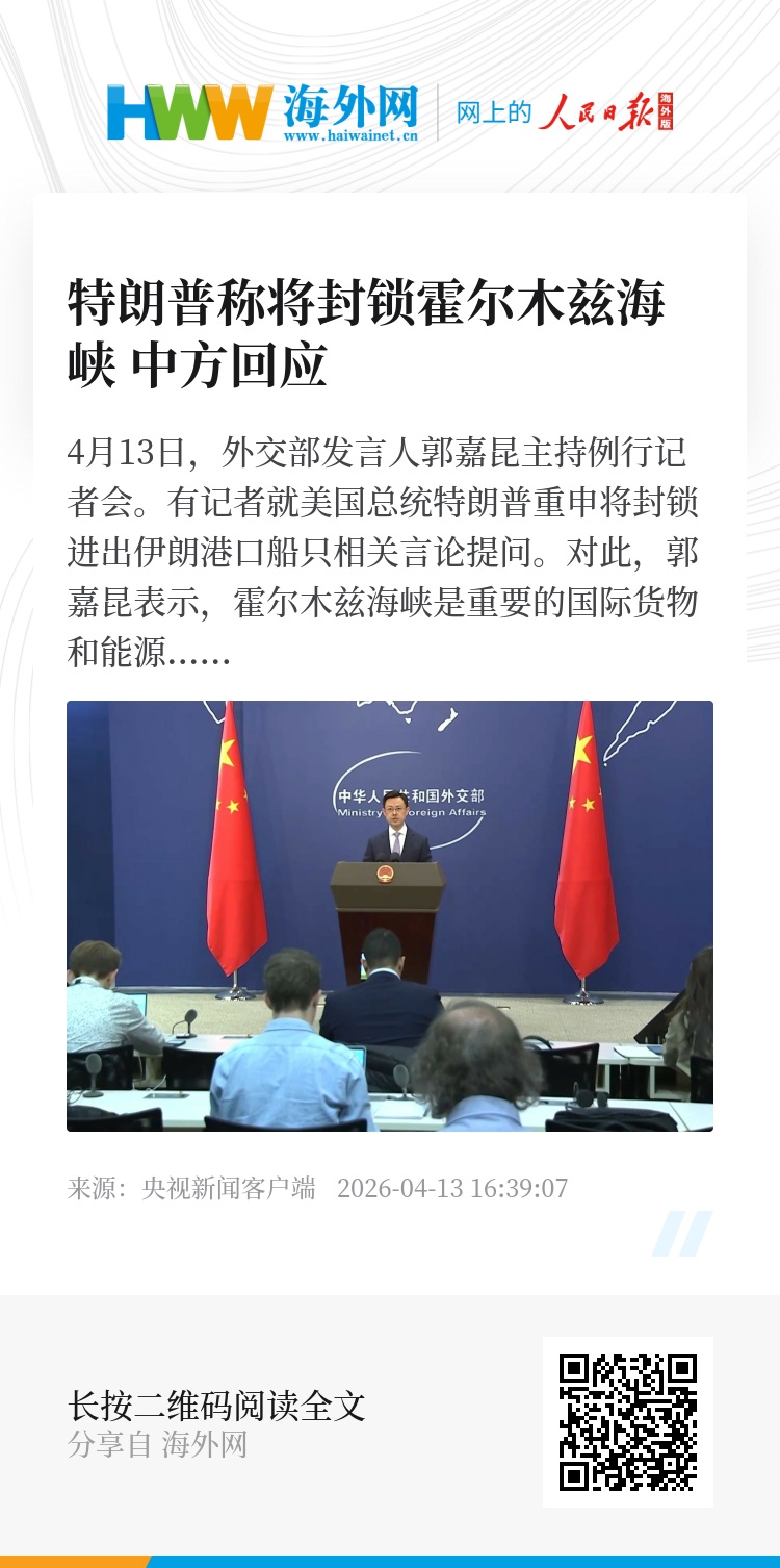 4月13日,外交部发言人郭嘉昆主持例行记者会。有记者就美国总统特朗普重申将封锁进出伊朗港口船只相关言论提问。
