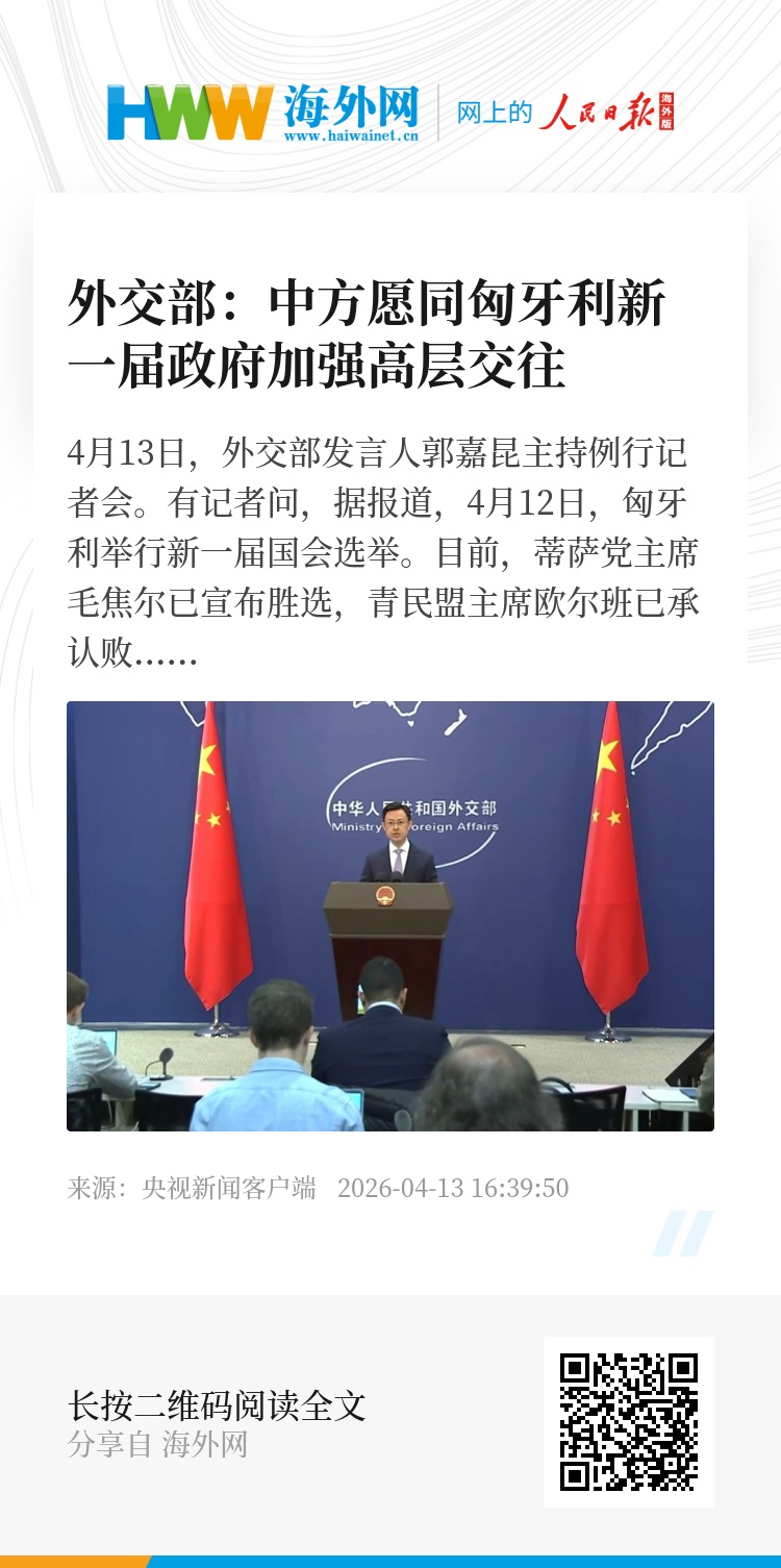4月13日,外交部发言人郭嘉昆主持例行记者会。有记者问,据报道,4月12日,匈牙利举行新一届国会选举。目前,蒂萨党主席毛焦尔已宣布胜选,青民盟主席欧尔班已承认败选并向毛焦尔表示祝贺。中方对此有何评论?对中匈关系未来发展有何期待?