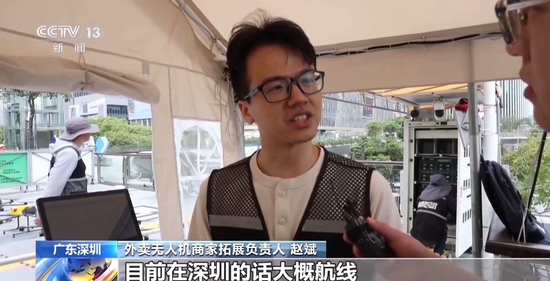 外卖无人机商家拓展负责人 赵斌:有20台飞机每小时上限可以送50单,整体的配送时长比人力配送的时间会缩短30%以上。目前在深圳航线开了将近60条,订单量近几个月比去年增长了150%以上。