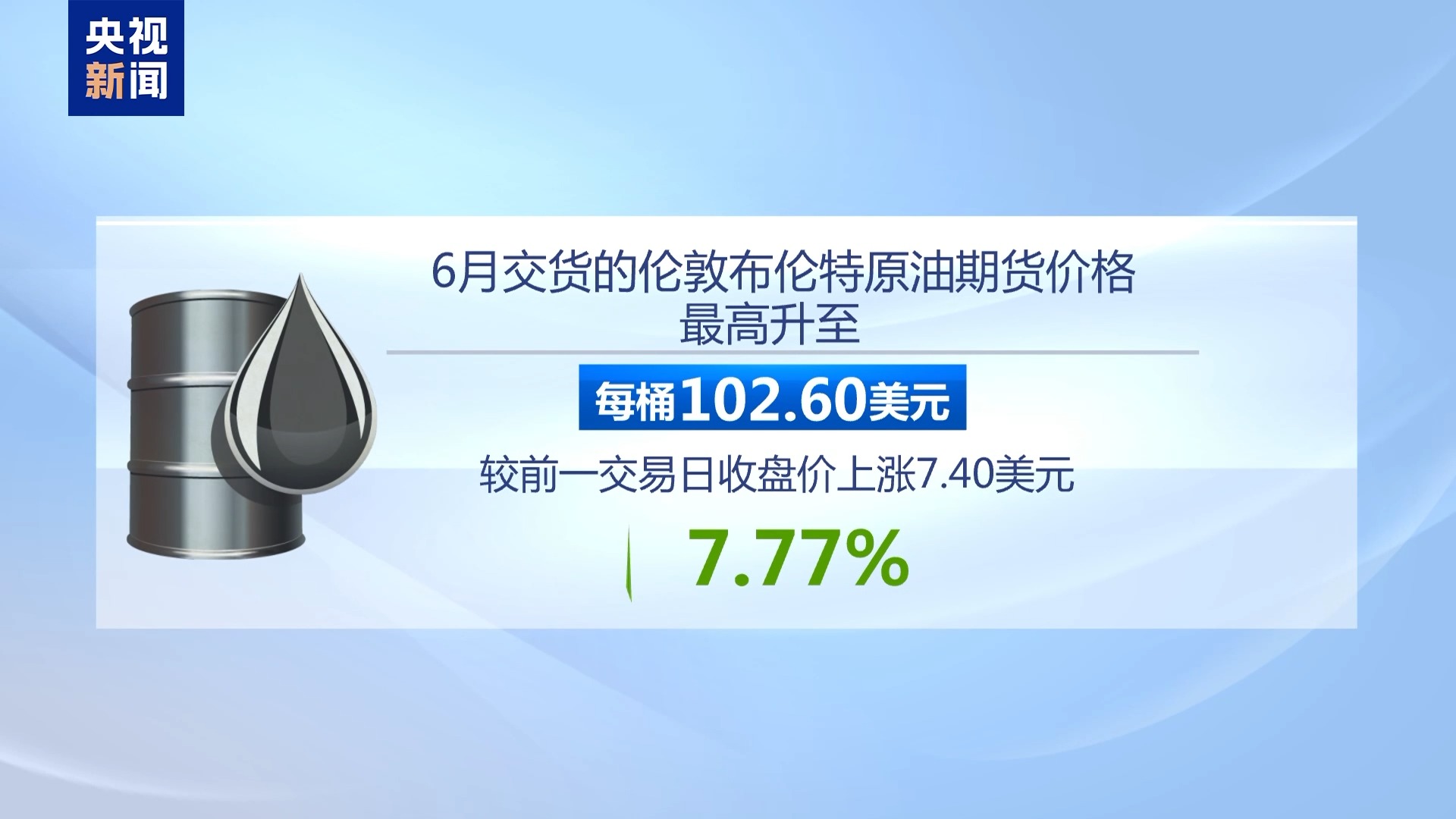 截至美东时间12日18时30分,也就是北京时间13日6时30分,纽约商品交易所5月交货的轻质原油期货价格最高升至每桶105.53美元,较前一交易日收盘价上涨 8.96美元,涨幅达9.28%;6月交货的伦敦布伦特原油期货价格最高升至每桶102.60美元,较前一交易日收盘价上涨7.40美元,涨幅为7.77%。