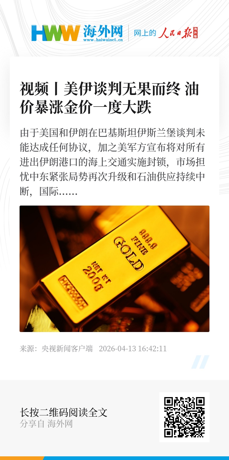 由于美国和伊朗在巴基斯坦伊斯兰堡谈判未能达成任何协议,加之美军方宣布将对所有进出伊朗港口的海上交通实施封锁,市场担忧中东紧张局势再次升级和石油供应持续中断,国际油价12日在新一周交易开始后大幅上涨,国际金价则出现大跌。