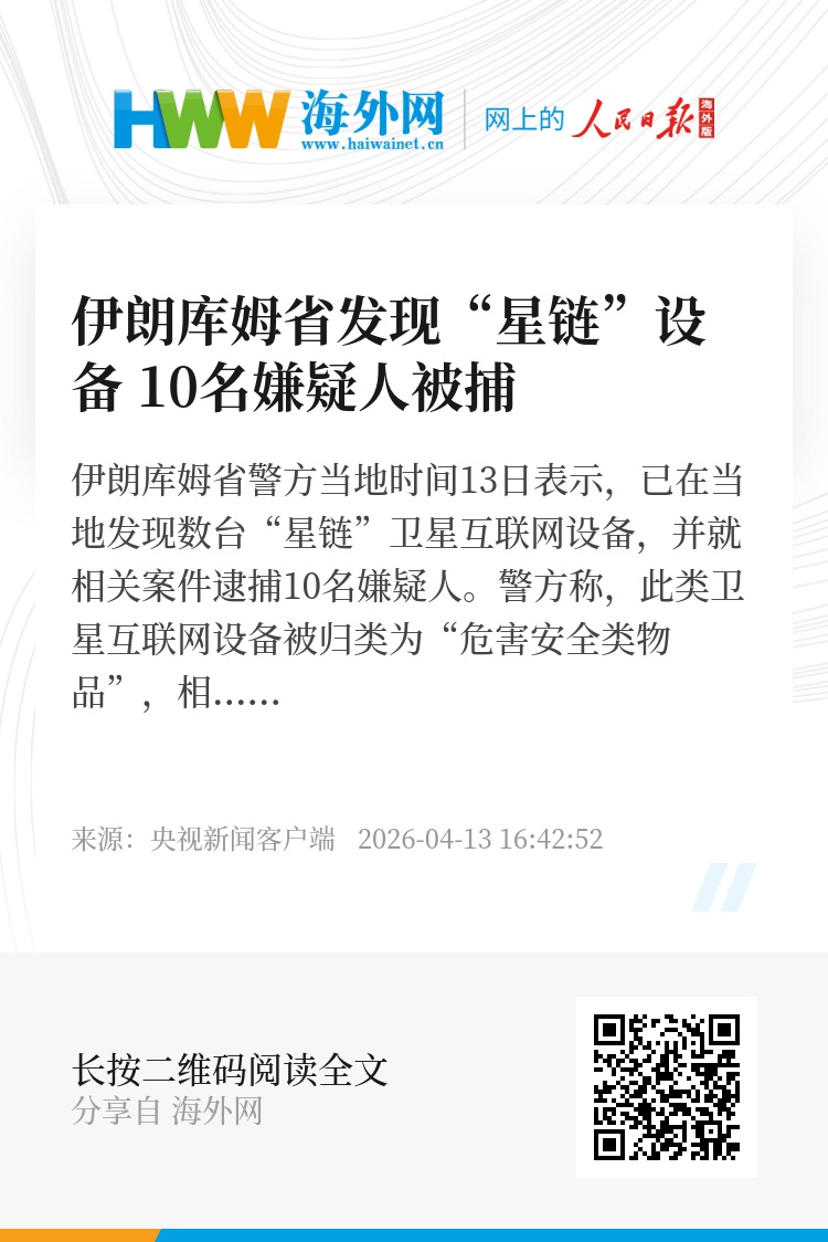 伊朗库姆省警方当地时间13日表示,已在当地发现数台“星链”卫星互联网设备,并就相关案件逮捕10名嫌疑人。