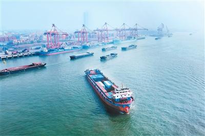 近日,一艘装载集装箱的货轮驶离江苏省扬州港码头。