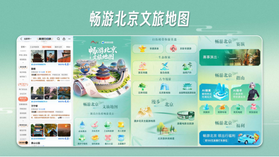 在发布榜单的基础上,北京市文化和旅游局局还携手高德发布了“畅游北京”文旅地图,以智能推荐、惠民服务、互动共享为方向,系统集成扫街榜资源、精品游览线路、特色消费场景等内容,并上线AI文旅助手,提供24小时智能咨询、个性化行程规划等服务,推动传统地图从基础查询、导航功能,向可推送、可游览、可消费的全场景智慧服务平台迭代升级。