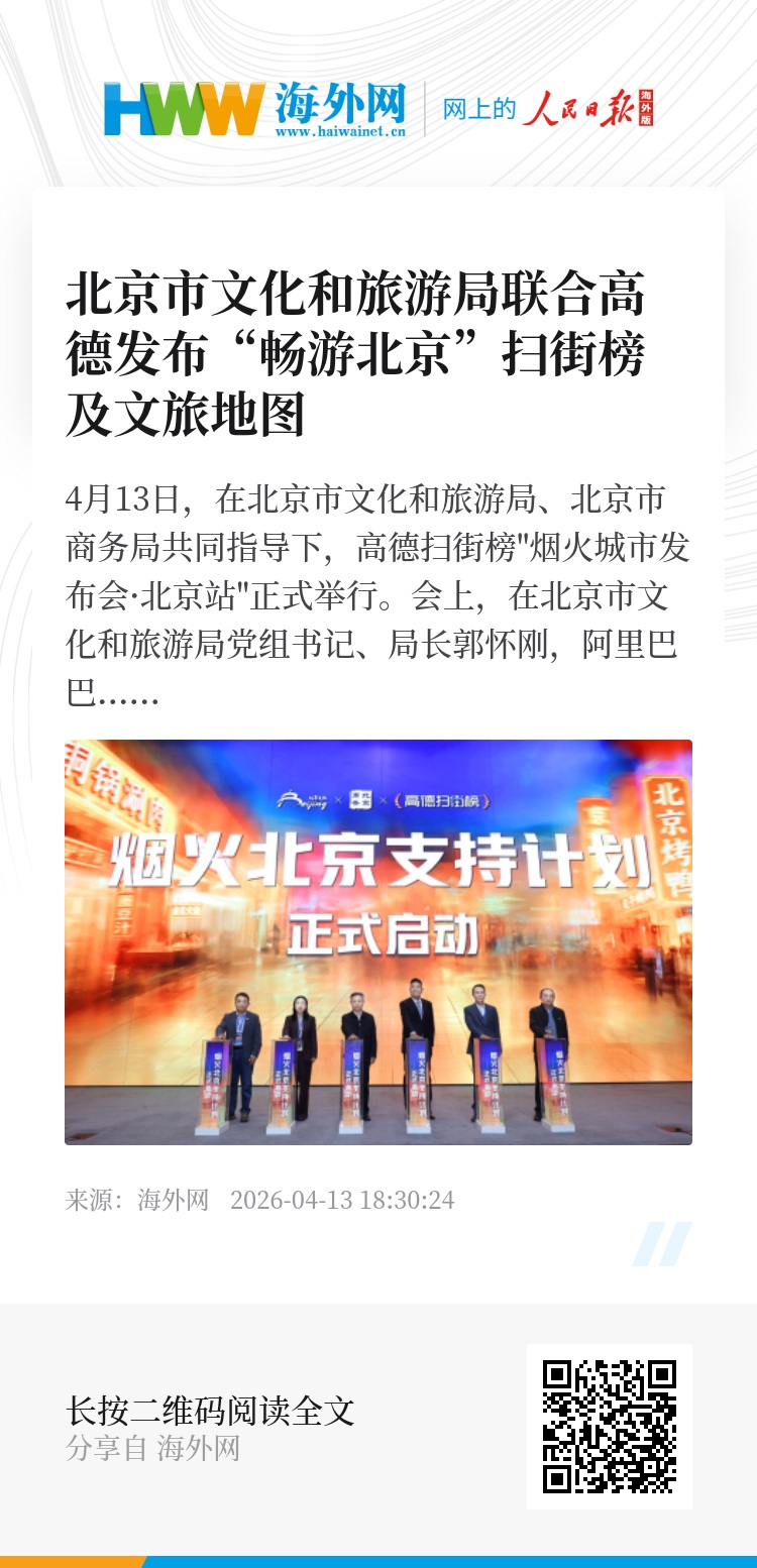 4月13日,在北京市文化和旅游局、北京市商务局共同指导下,高德扫街榜"烟火城市发布会·北京站"正式举行。会上,在北京市文化和旅游局党组书记、局长郭怀刚,阿里巴巴合伙人、高德董事长刘振飞的共同见证下,北京市文化和旅游局与高德地图签署战略合作协议,并联合市商务局、高德地图正式发布“畅游北京”扫街榜及文旅地图,同步启动"烟火北京支持计划",通过数字化、智能化手段推动文商旅深度融合,助力北京国际消费中心城市建设。