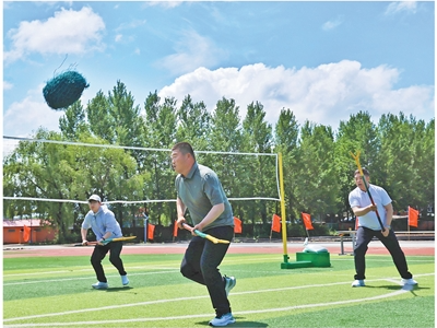 校园操场上传来阵阵欢呼声,毕洪兵正带着学生练习,草球在空中划出弧线,木叉精准扬起。不远处的文化广场上,尤卫萍的舞蹈排练刚结束,围观的老人、孩子还在学着比划投叉的动作。