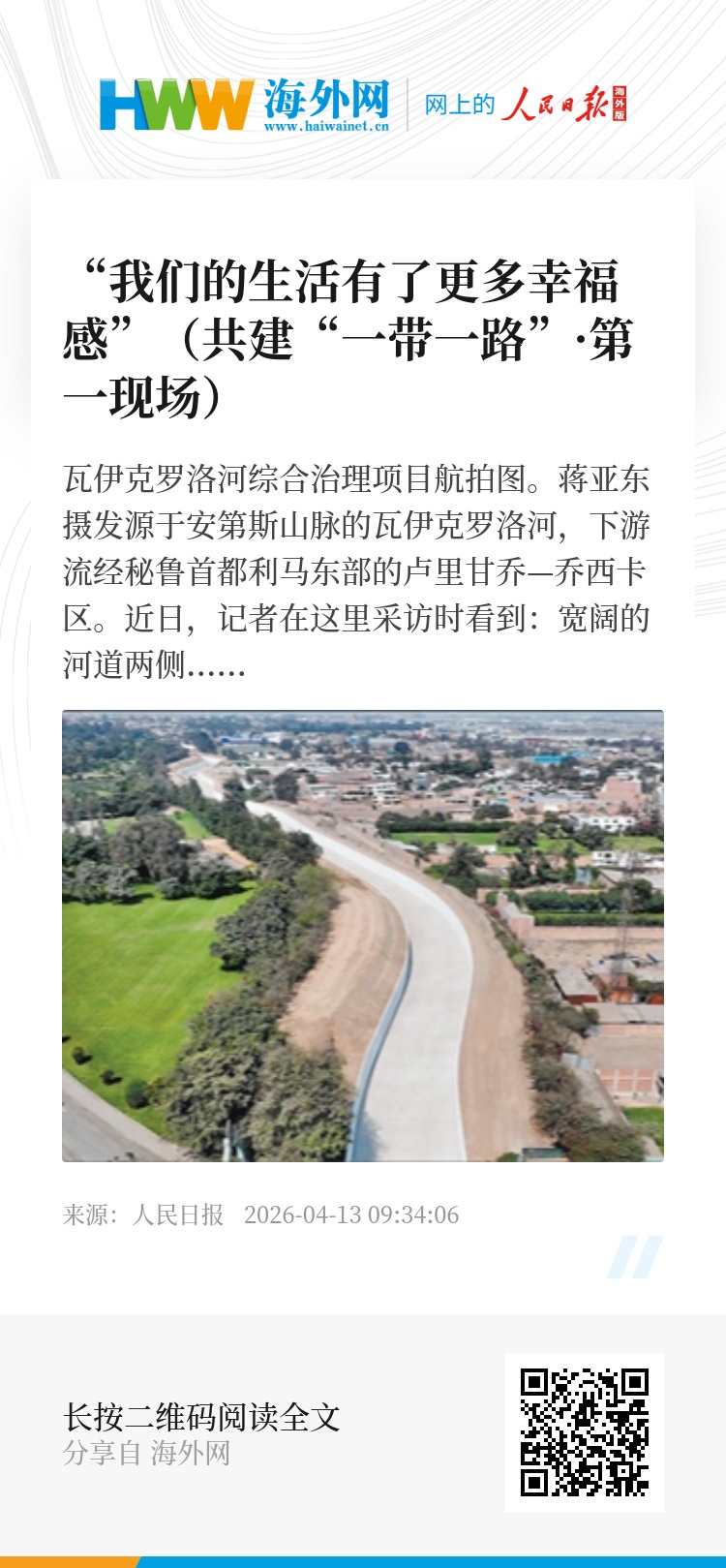 发源于安第斯山脉的瓦伊克罗洛河,下游流经秘鲁首都利马东部的卢里甘乔—乔西卡区。近日,记者在这里采访时看到:宽阔的河道两侧,新筑起坚固的混凝土墙面,河道底部经过硬化处理,周边新建了公园和绿化区。“中企建设的综合治理项目完工,是我们防灾减灾的重要里程碑事件,居民们感觉安全多了。”卢里甘乔—乔西卡区圣玛利亚社区负责人杰奎琳·丰塞卡对人民日报记者说,该项目的正式完工标志着当地防灾减灾体系建设迈入新阶段。当地民众生活、出行条件得到改善,幸福感、安全感和发展信心不断增强。