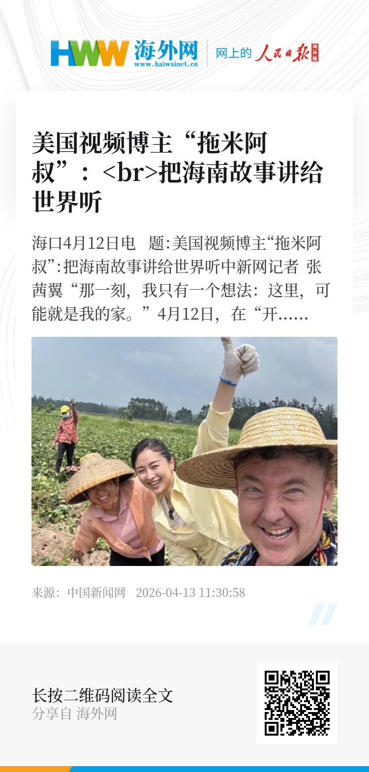 中新网海口4月12日电 题:美国视频博主“拖米阿叔”:把海南故事讲给世界听