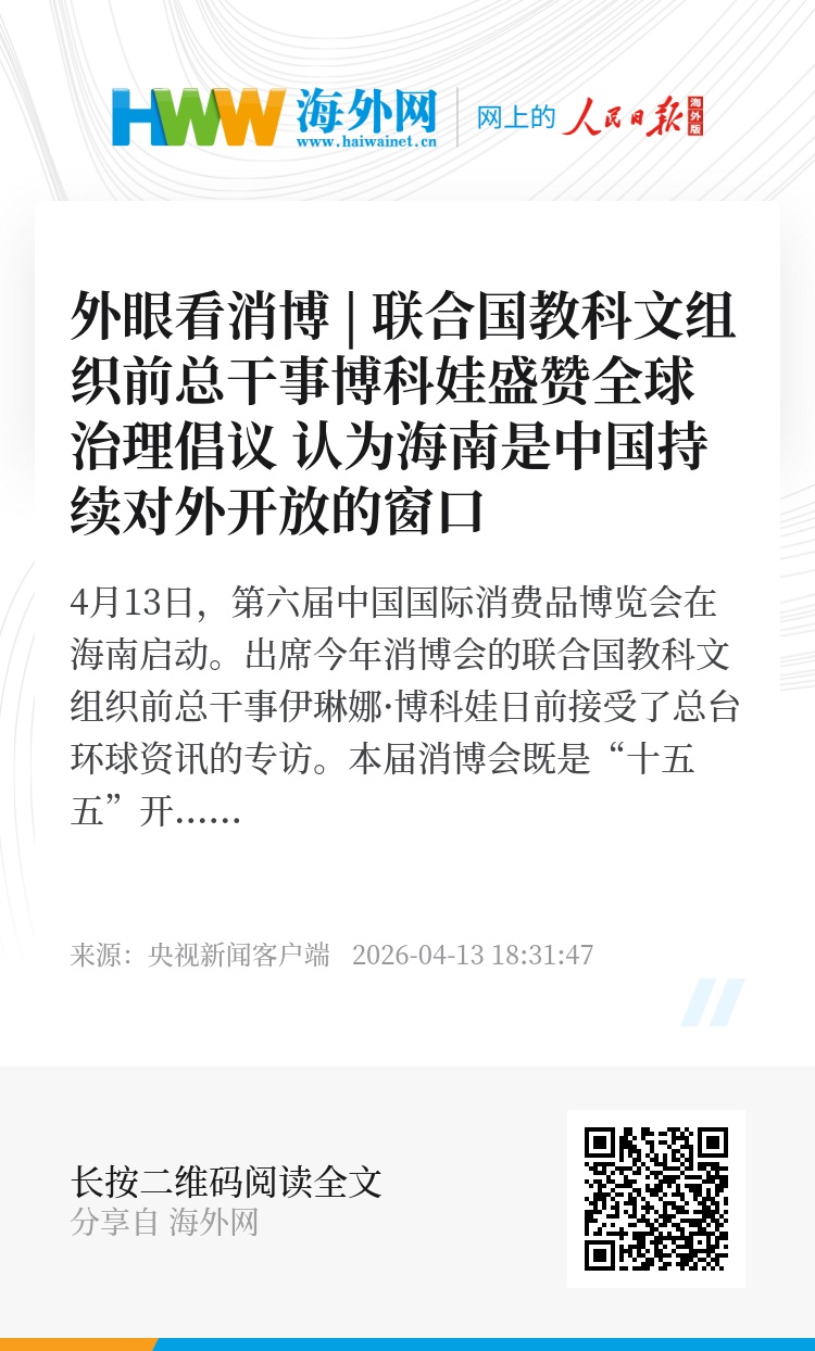 4月13日,第六届中国国际消费品博览会在海南启动。出席今年消博会的联合国教科文组织前总干事伊琳娜·博科娃日前接受了总台环球资讯的专访。