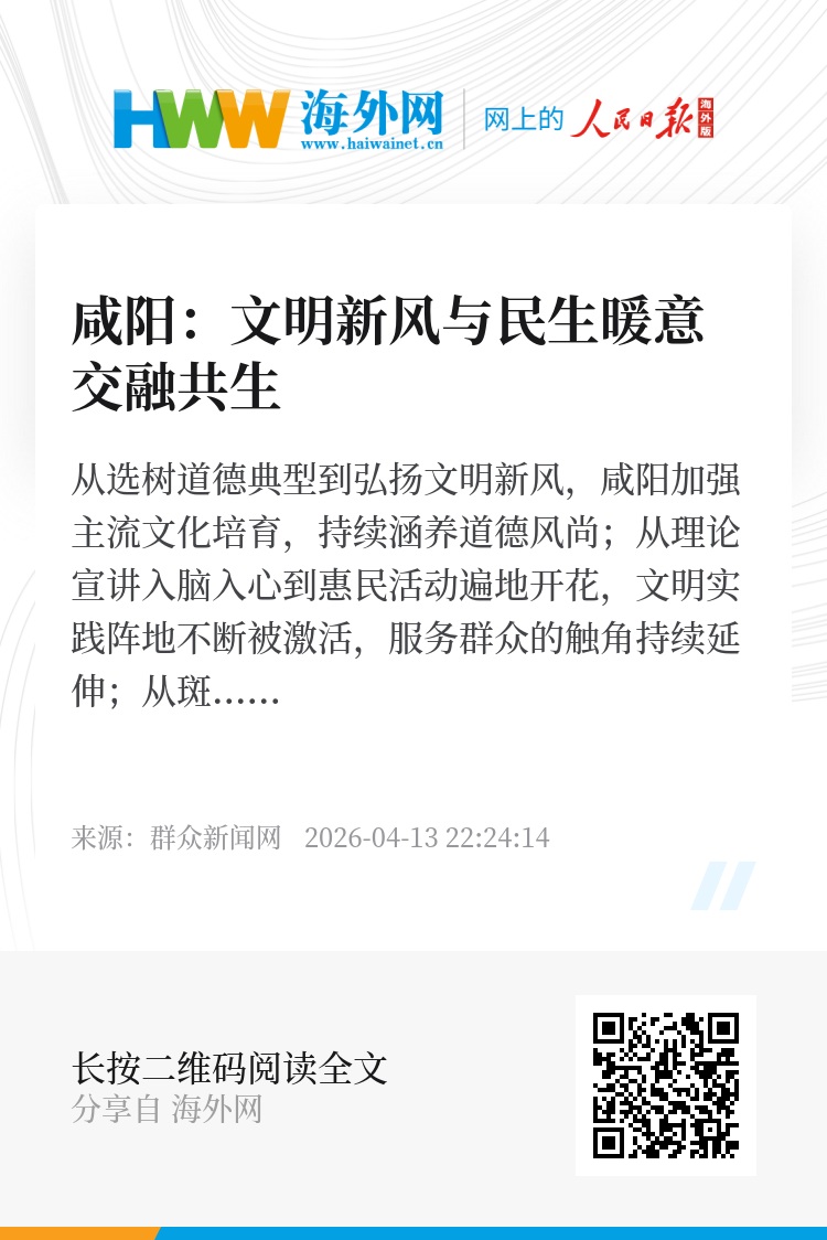 千年古都,文脉绵延。近年来,咸阳市坚持一体推进文明培育、文明实践、文明创建融合发展,城乡文明同频共振、城市治理精准高效、民生福祉持续增进,一座有底蕴、有质感、有温度的文明之城,在渭水之滨焕发蓬勃生机。
