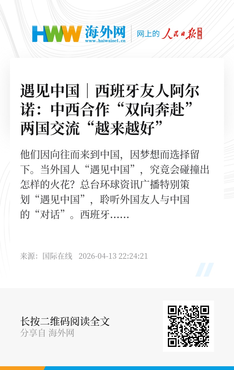 阿尔诺的经历恰好印证了近年来中西人员往来的活跃态势。2025年,到西班牙游览的中国游客近80万人次,保持了快速增长势头;得益于中方的签证便利化措施,西班牙赴华人数也在快速增加。中国文化在西班牙的影响力不断扩大。目前西班牙有10所孔子学院和1所孔子课堂,中国则有100多所高校开设西班牙语专业。阿尔诺正是这场双向热潮的亲历者。