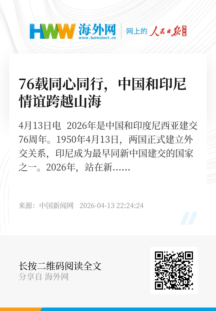 中新网4月13日电 2026年是中国和印度尼西亚建交76周年。1950年4月13日,两国正式建立外交关系,印尼成为最早同新中国建交的国家之一。