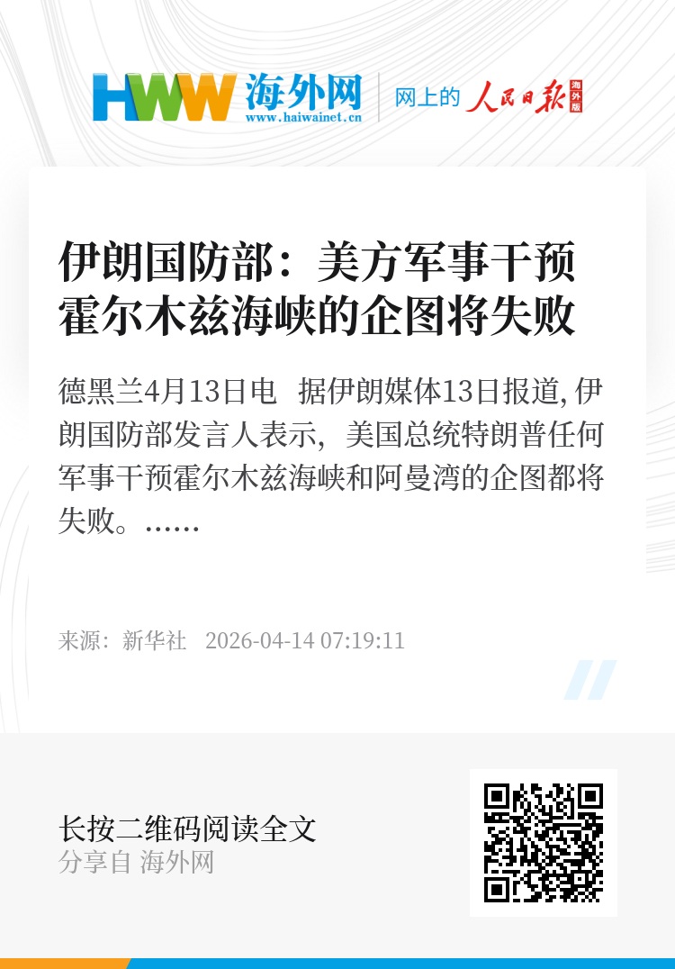 新华社德黑兰4月13日电 据伊朗媒体13日报道,伊朗国防部发言人表示,美国总统特朗普任何军事干预霍尔木兹海峡和阿曼湾的企图都将失败。