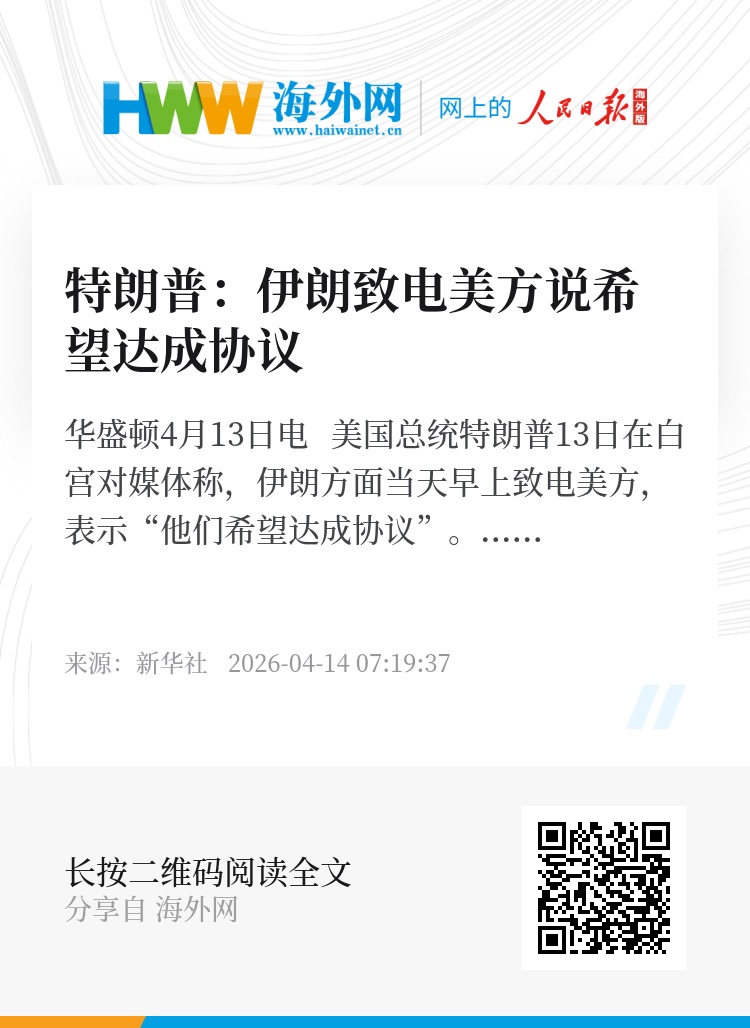 新华社华盛顿4月13日电 美国总统特朗普13日在白宫对媒体称,伊朗方面当天早上致电美方,表示“他们希望达成协议”。