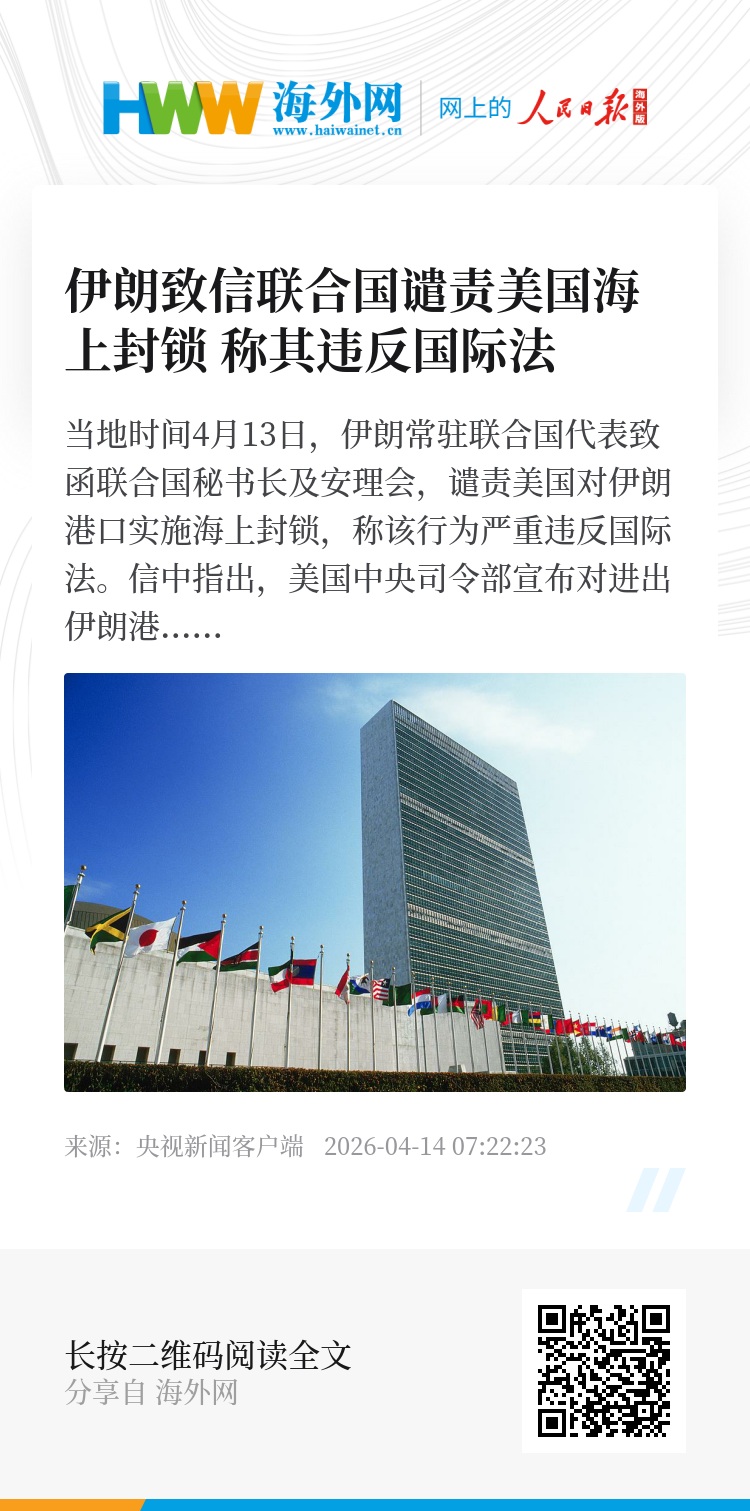 当地时间4月13日,伊朗常驻联合国代表致函联合国秘书长及安理会,谴责美国对伊朗港口实施海上封锁,称该行为严重违反国际法。