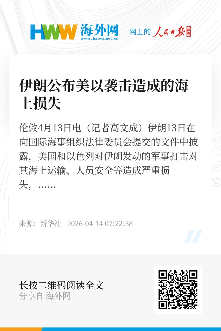 新华社伦敦4月13日电(记者高文成)伊朗13日在向国际海事组织法律委员会提交的文件中披露,美国和以色列对伊朗发动的军事打击对其海上运输、人员安全等造成严重损失,39艘商船遭袭并沉没、110艘传统渔船被毁,另导致20名海员死亡。