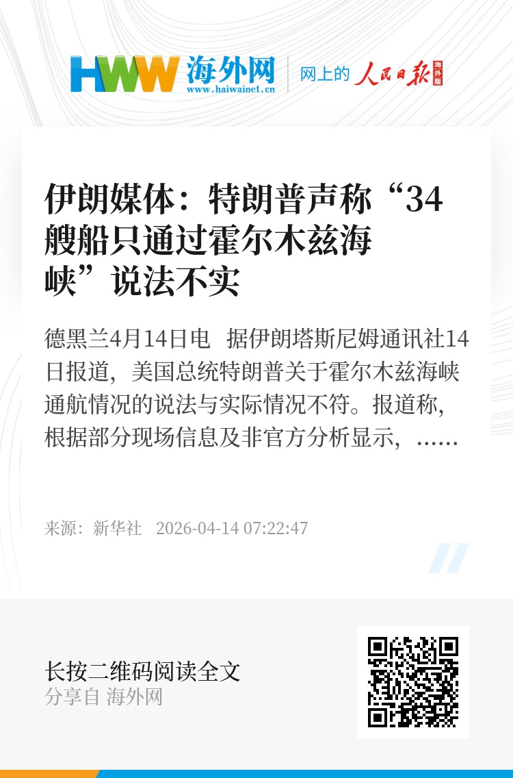 新华社德黑兰4月14日电 据伊朗塔斯尼姆通讯社14日报道,美国总统特朗普关于霍尔木兹海峡通航情况的说法与实际情况不符。