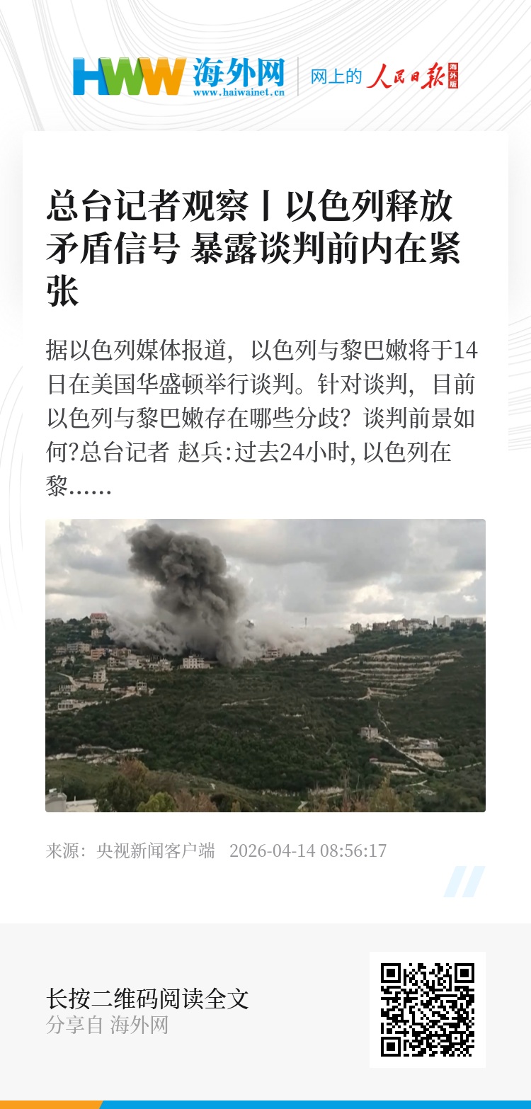 总台记者 赵兵:过去24小时,以色列在黎巴嫩战线的动作出现明显反差。一方面,据以色列媒体称,应美国要求,以军对贝鲁特的打击强度有所下降,为当地时间14日在美国举行的以黎谈判营造所谓的氛围。但另一方面,以色列却又空袭了黎巴嫩大约30个目标,总理内塔尼亚胡更亲赴黎南部,在高阶将领陪同下宣称“战争仍在继续”。以媒体认为,这暴露了以色列在谈判前的内在紧张:既想展开谈判,又不想让对方看出急于求成,还想高举军事大棒进行威胁。