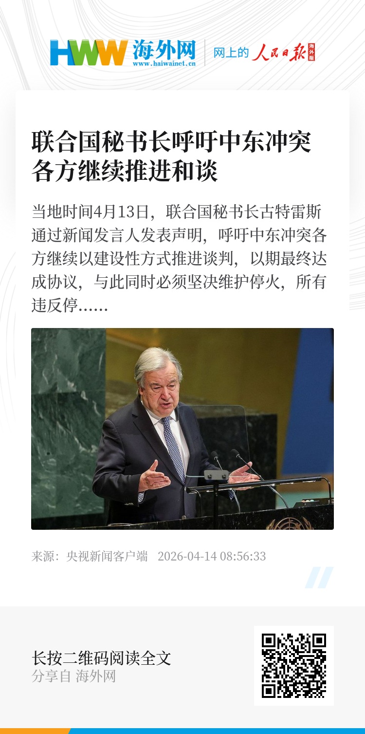 当地时间4月13日,联合国秘书长古特雷斯通过新闻发言人发表声明,呼吁中东冲突各方继续以建设性方式推进谈判,以期最终达成协议,与此同时必须坚决维护停火,所有违反停火的行为都必须停止。